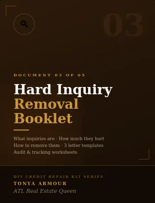 The complete guide to hard inquiries — exactly how many points each one costs, which can be removed and why, and the step-by-step removal process. Includes 3 specialized removal letters and a full inquiry audit worksheet.
